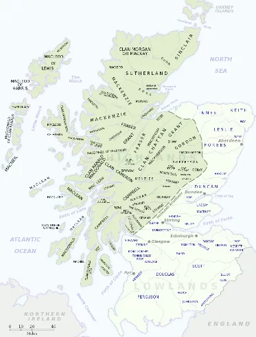 Es gibt in Schottland mehr als 400 Clans, einige davon auch ohne Clanchief. Alle aber haben ihr Wappen und ihre Farben. Eine Auflistung der Clans findet ihr hier und hier. Die Karte rechts zeigt die Verteilung ihres Landes.